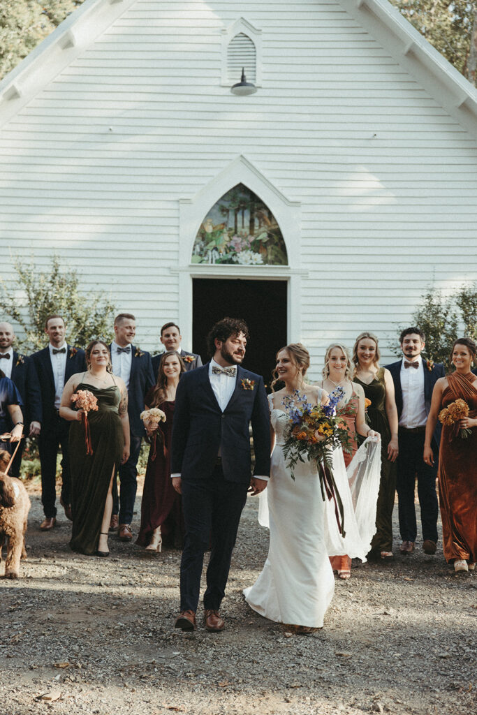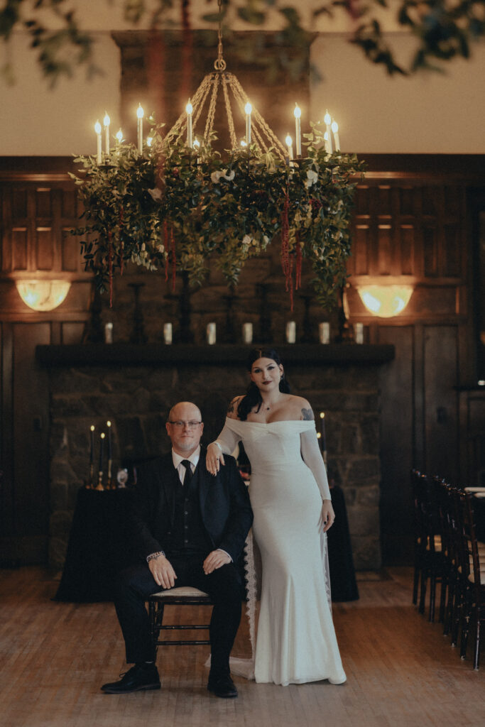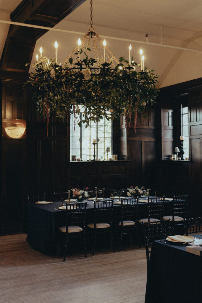 The combination of a dark chapel where light streams through stained glass windows and a separate schoolhouse reception space gives couples two distinct atmospheres, all in one location.