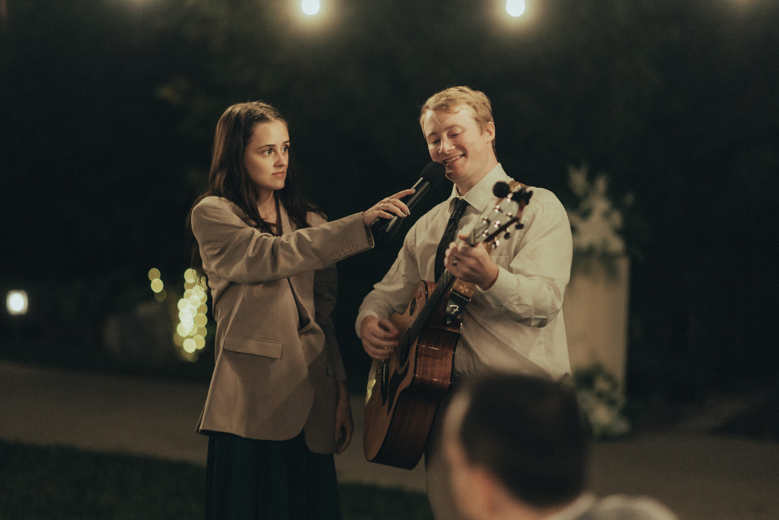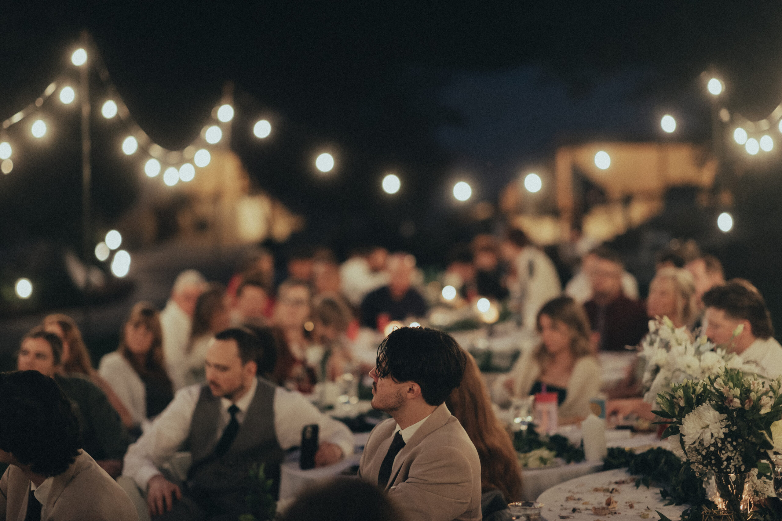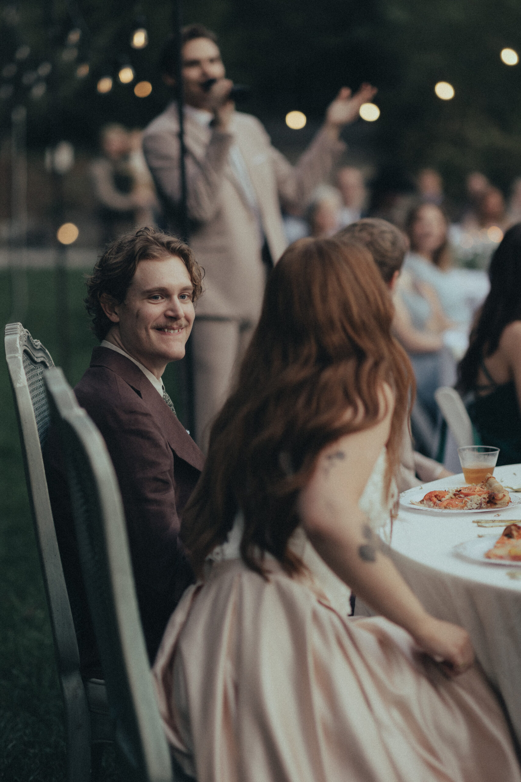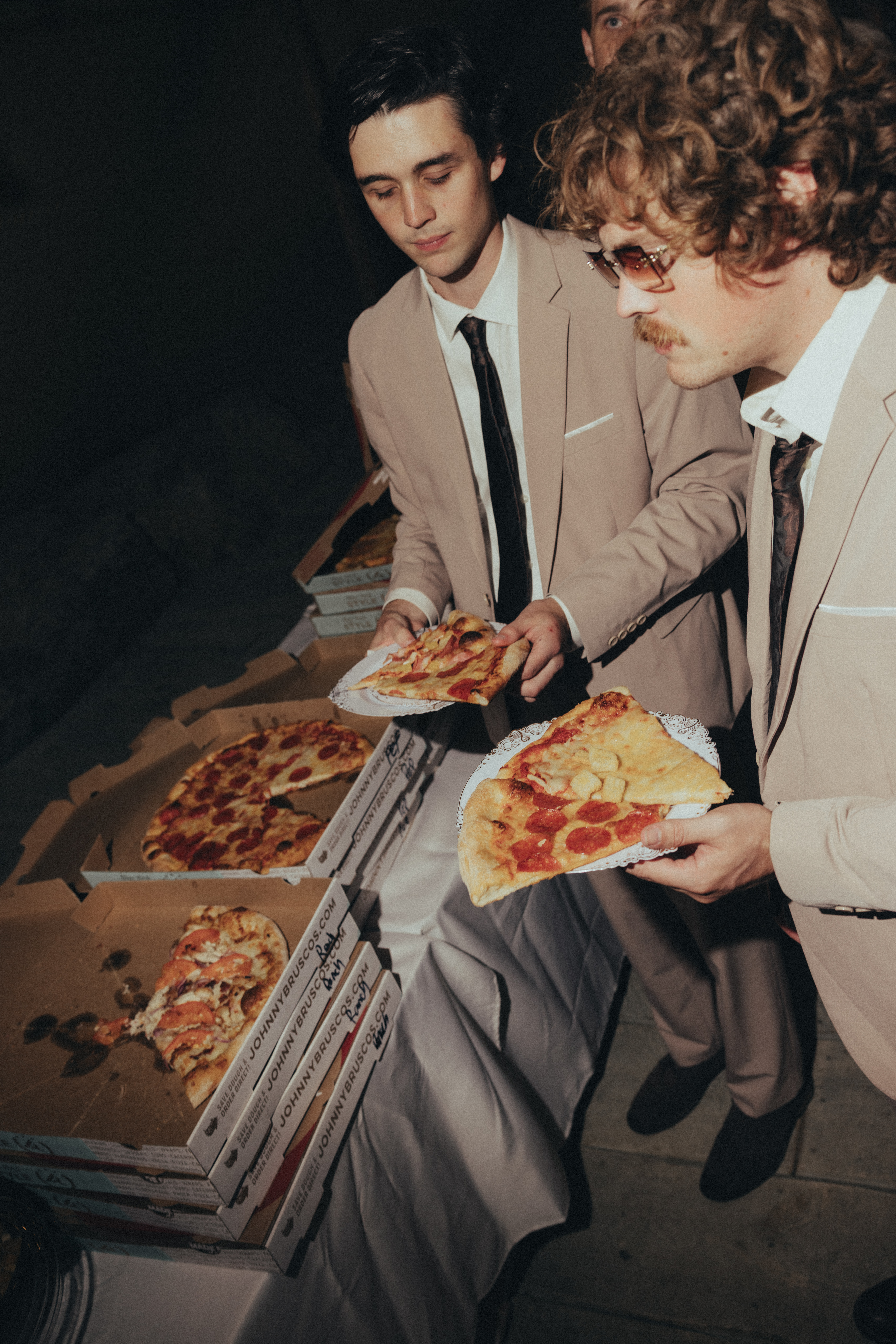 After their ceremony, the night flowed into the kind of celebration that was very “them”. A live jazz band playing under string lights, the smell of fresh pizza drifting through the open-air reception space, and their closest people dancing long after the sun slipped behind the trees.